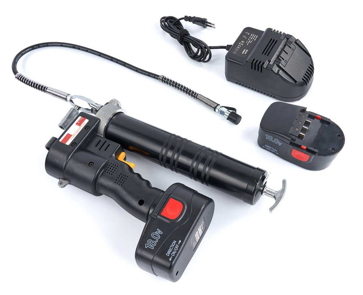 Vysokokvalitný akumulátorový lis na mazivo s dvoma batériami ponúka až 2× rýchlejšiu prevádzku ako ručný lis na mazivo Výstupný tlak 550 barov (8 000 PSI) s dodávkou 100 gramov za minútu.