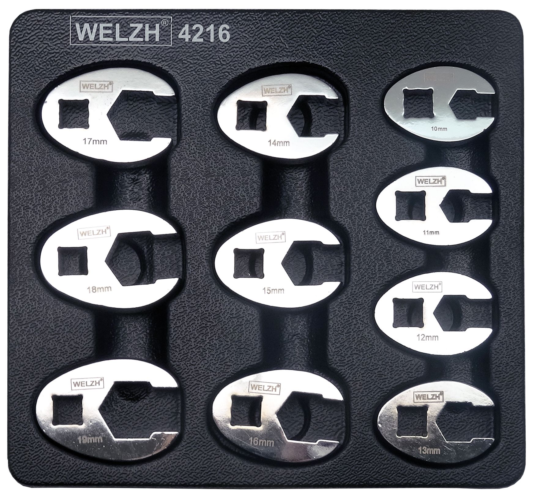 - Kľúče "Crowfoot" ploché otvorené 3/8'', CrV, 10 - 19 mm, sada 10 dielov, Welzh