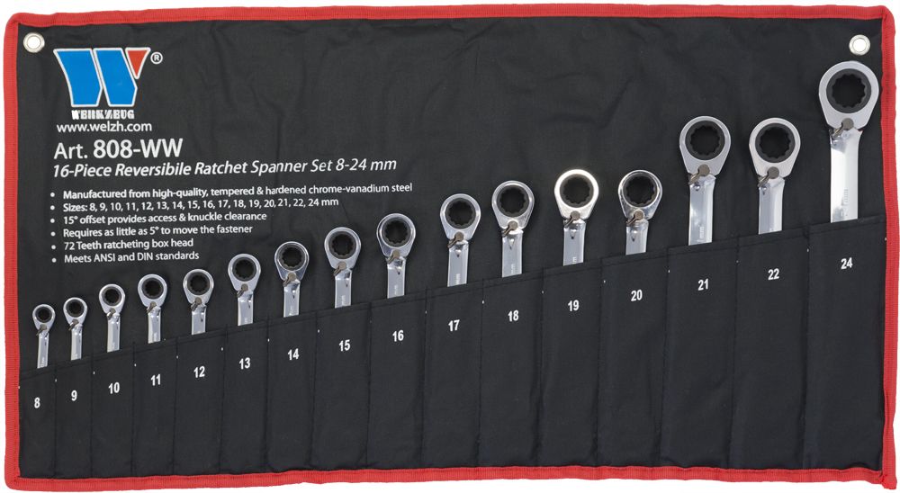 Ráčnové kľúče 8 - 24 mm, CrV, sada 16 dielov, Welzh
