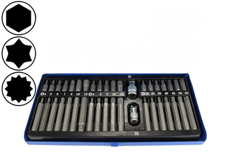- Kombi sada bitov 10 mm, Inbus, Torx, XZN, adaptér 3/8" a 1/2", 40 ks, CrV, Condor Werkzeug