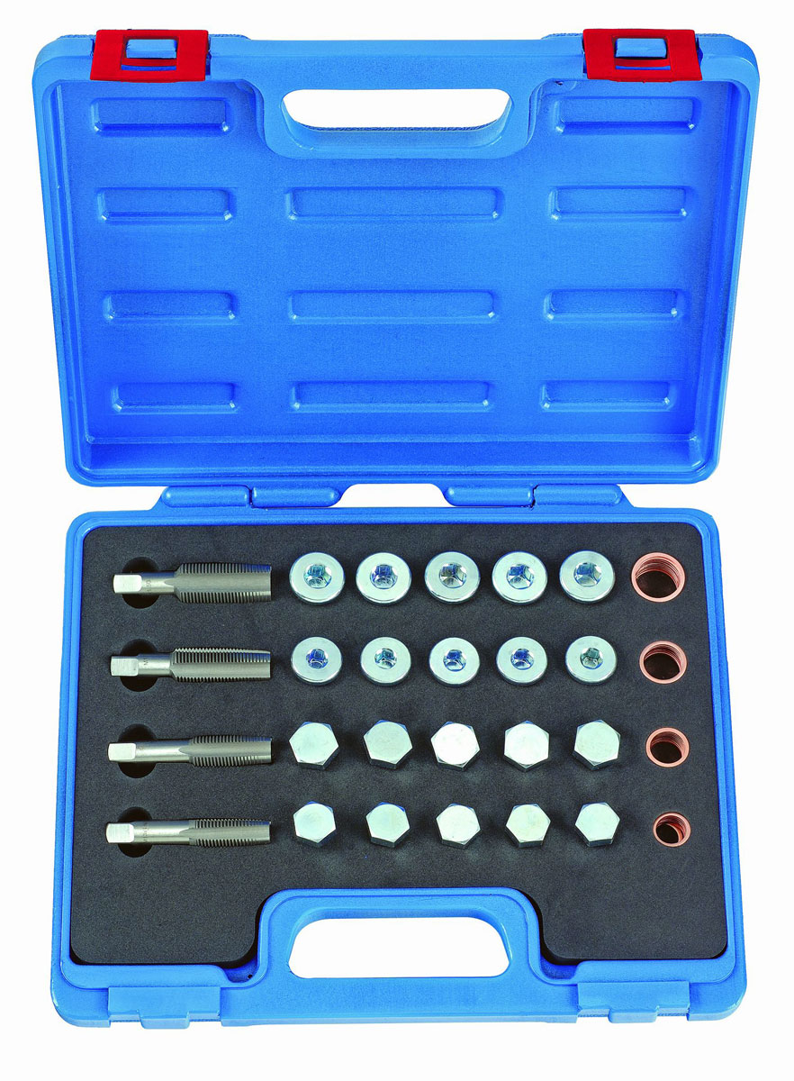 Popis: Sada obsahuje prípravky na rezanie závitu skrutiek olejovej vane. Pôvodný závit je preťatý väčším kohútikom a vybavený väčšou skrutkou s medeným tesnením. Vhodné pre vozidlá:AudiBMWFordFiatOpelPeugeotNissanPorscheSkodaToyotaVolvoVWSaabSeatHondaMazda Dodávané v PVC kazete.