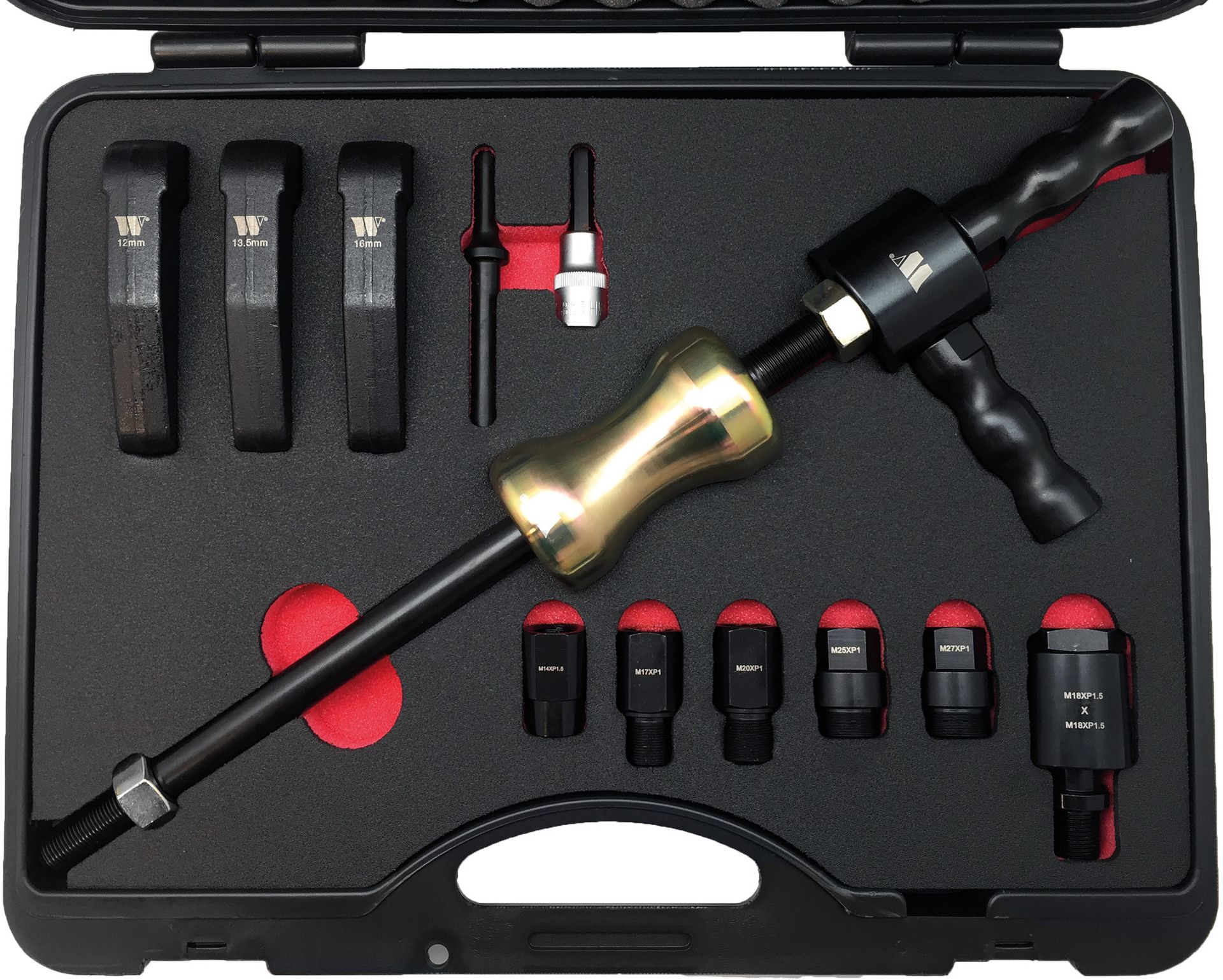 - Sada prípravkov s reverzným kladivom na demontáž vstrekovačov, sada 12 dielov, Welzh