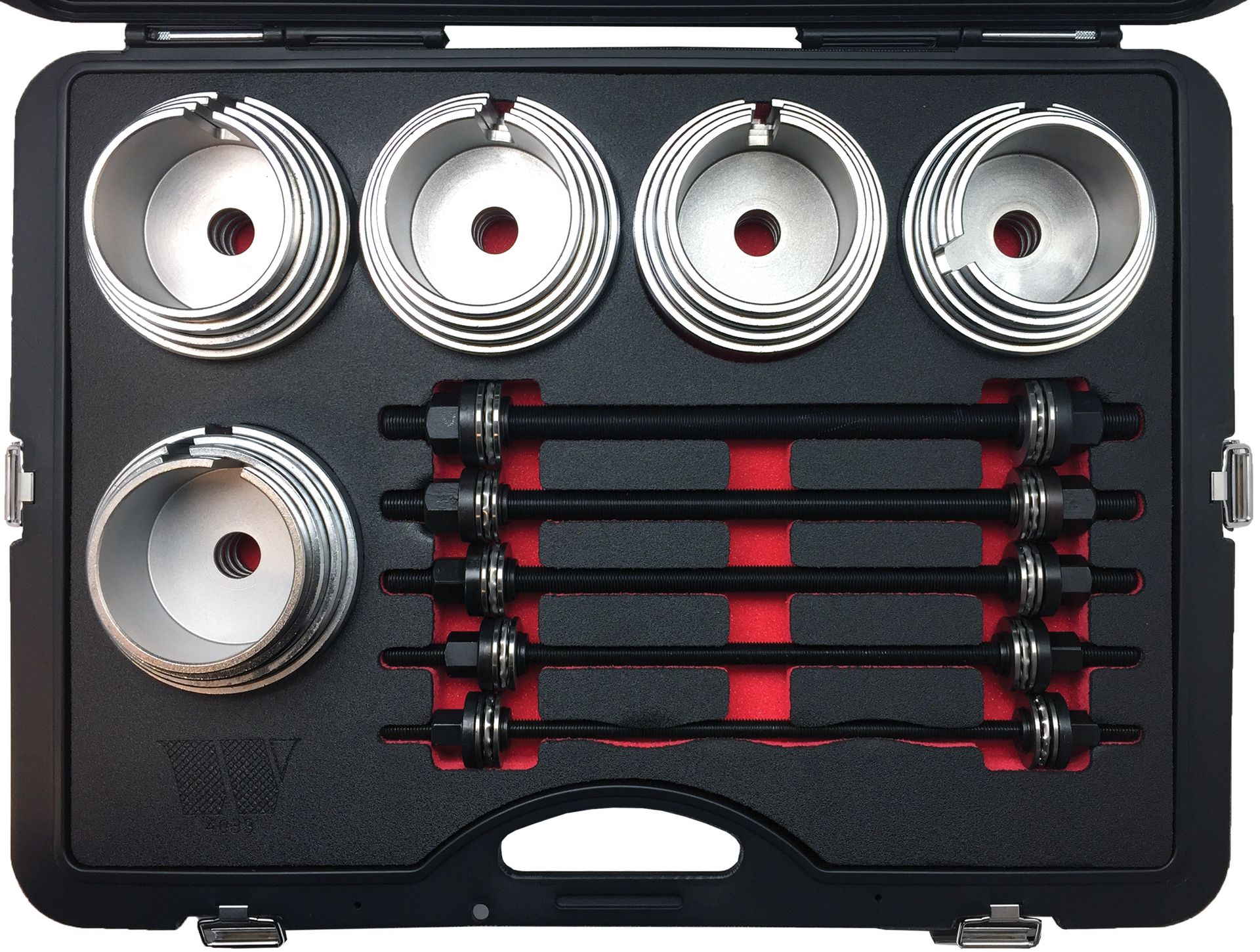Súprava nástrojov na montáž a demontáž silentblokov a ložísk je skvelým dielenským príslušenstvom a je vhodná pre všetky opravovne. Diely montážnej súpravy sú vyrobené z vysokokvalitnej ocele a sú úhľadne zostavené v praktickom kufríku. Všestranné použitie vďaka možnosti výberu z 20 priemerov stláčacích podložiek so štrbinou na optickú kontrolu. Kompletná sada pre SUV, ľahké nákladné vozidlá, PSV a ťažké nákladné vozidlá.