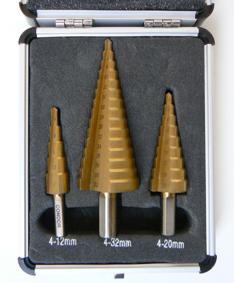 Vrtáky stupňovité 4-12, 4-20, 4-32, sada 3ks, HSS-TiN, Condor Werkzeug
