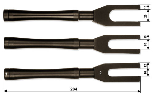 Pri práci s týmto nástrojom dodržiavajte zvýšené bezpečnostné opatrenia, používajte ochranné okuliare a kožené rukavice.Odstráňte maticu z čapu. Vyčistite priestor medzi guľovým čapom a okom riadiacej páky. Medzi páku riadenia a guľový čap vložte vybíjaciu vidlicu. V smere osi razníka udrite primeranou silou paličkou do čela rukoväte razidla s pracovnou plochou z medi alebo duralu. Opakujte, kým sa guľový čap úplne neuvoľní.Guľový čap sa spájkovaním neuvoľňuje.